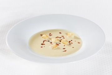 - Jemná krémová polévka z pečeného česneku s restovanými slaninovými krutony